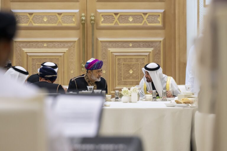 The banquet was attended by His Highness Sheikh Mansour bin Zayed Al Nahyan, Vice President, Deputy Prime Minister and Chairman of the Presidential Court; H.H. Sheikh Khaled bin Mohamed bin Zayed Al Nahyan, Crown Prince of Abu Dhabi; H.H. Sheikh Hamdan bin Zayed Al Nahyan, Ruler’s Representative in Al Dhafra Region; H.H. Sheikh Suroor bin Mohammed Al Nahyan; H.H. Lt. General Sheikh Saif bin Zayed Al Nahyan, Deputy Prime Minister and Minister of the Interior; H.H. Hamed bin Zayed Al Nahyan; H.H. Sheikh Abdullah bin Zayed Al Nahyan, Minister of Foreign Affairs; H.H. Sheikh Theyab bin Mohamed bin Zayed Al Nahyan, Deputy Chairman of the Presidential Court for Development and Fallen Heroes’ Affairs; H.H. Sheikh Hamdan bin Mohamed bin Zayed Al Nahyan; Sheikh Mohammed bin Hamad bin Tahnoun Al Nahyan, Adviser for Special Affairs at the Presidential Court; in addition to a number of other sheikhs, several former UAE ambassadors to the Sultanate of Oman and senior officials.